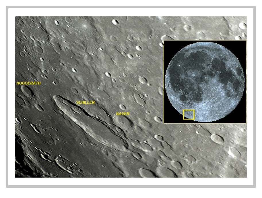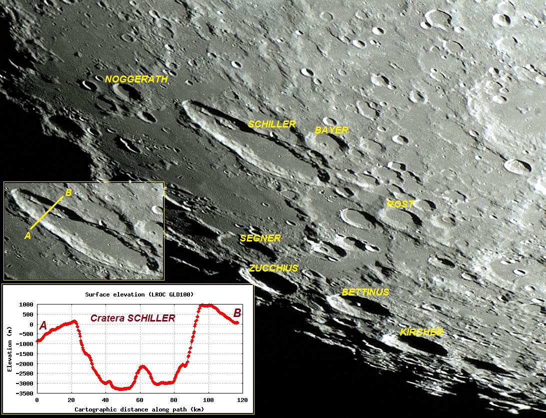 Schiller é uma cratera muito incomum de formato alongado, situada perto da borda sudoeste da Lua, região elevada e vastamente ocupada por crateras de impacto. O formato alongado de Schiller, que lembra uma elipse, fica ainda mais pronunciado pela proximidade com o limbo da Lua.