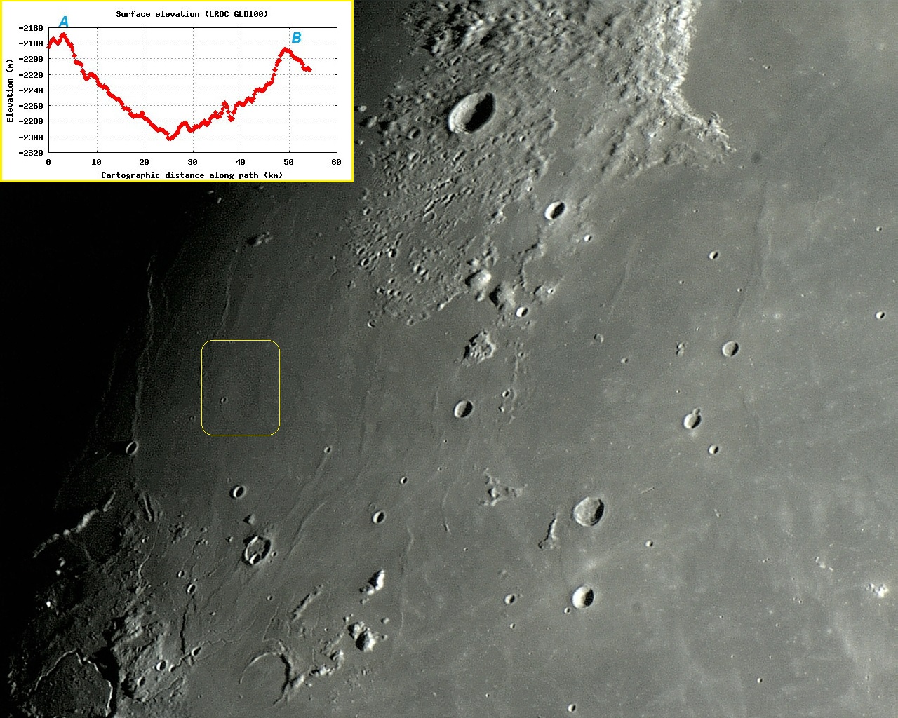 Foto: A cratera fantasma DAGUERRE, catalogada pela IAU, com seu perfil altimétrico. Foto executada com apenas 1 frame pelo VTOL.