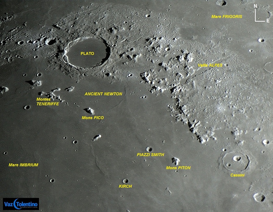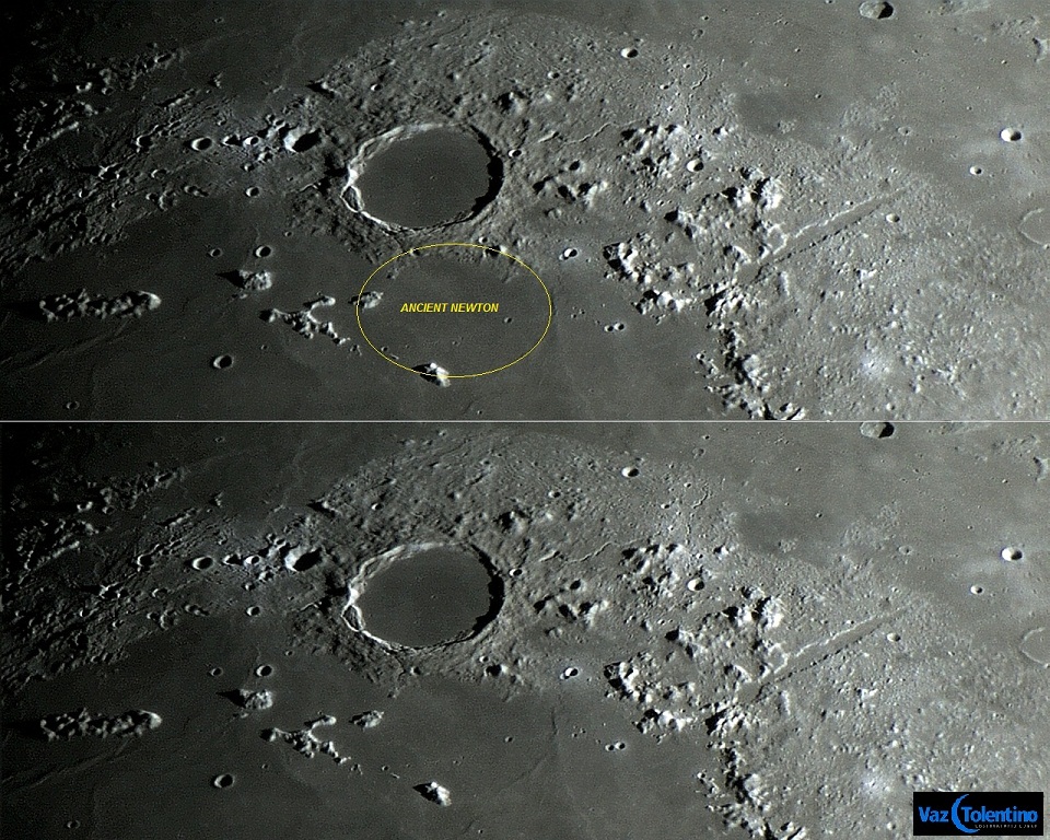 Ancient Newton (Newton Antigo) é o nome extraoficial para o resquício de anel fantasma mostrado no foto, que se estende desde a borda sul de PLATO, ao norte, até ao Mons PICO, ao sul.