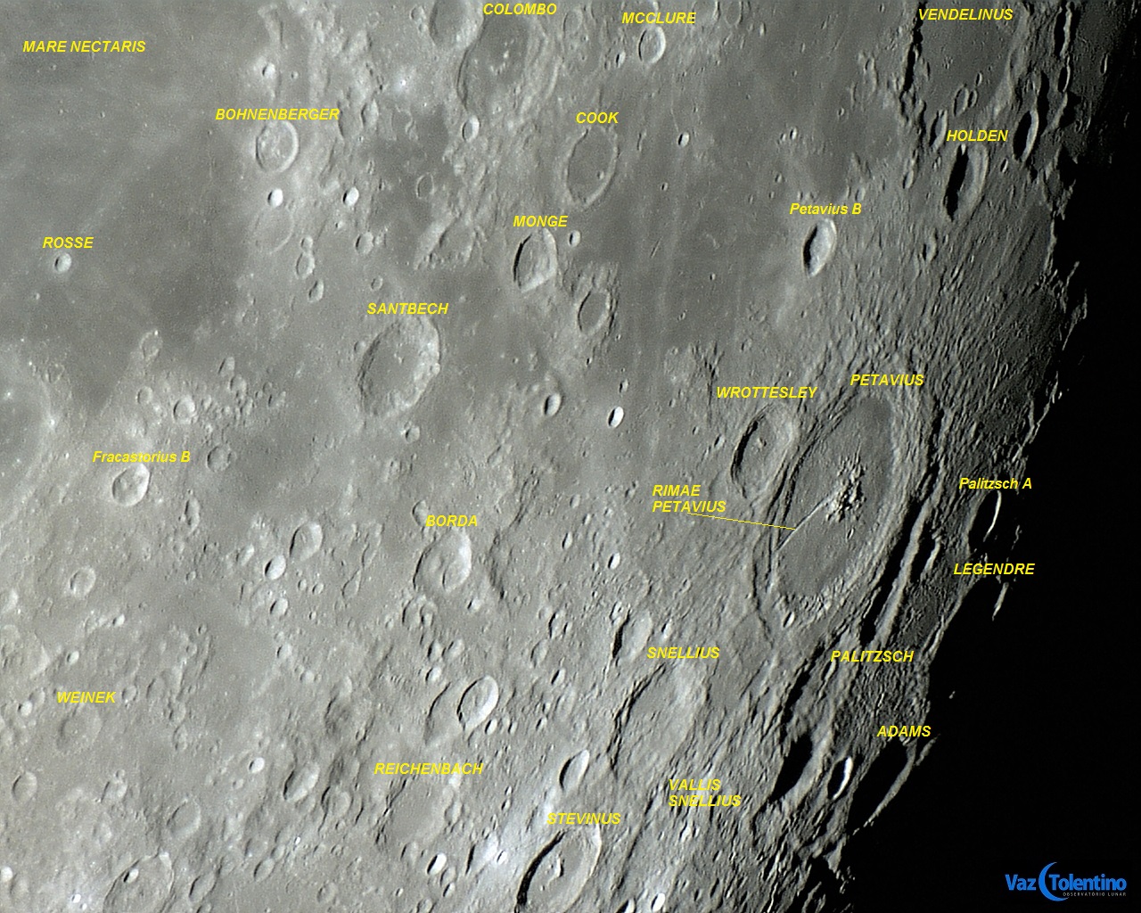 Externamente, perto da encosta sudeste de Petavius, existe uma formação alongada, formada pela junção alinhada de 3 crateras, criando um vale ou “calha”. Essa formação (que não aparece nesta foto) é conhecida como Vallis Palitzsch (extensão: 132 Km, Lat: 26.4º S Long: 64.3º E).