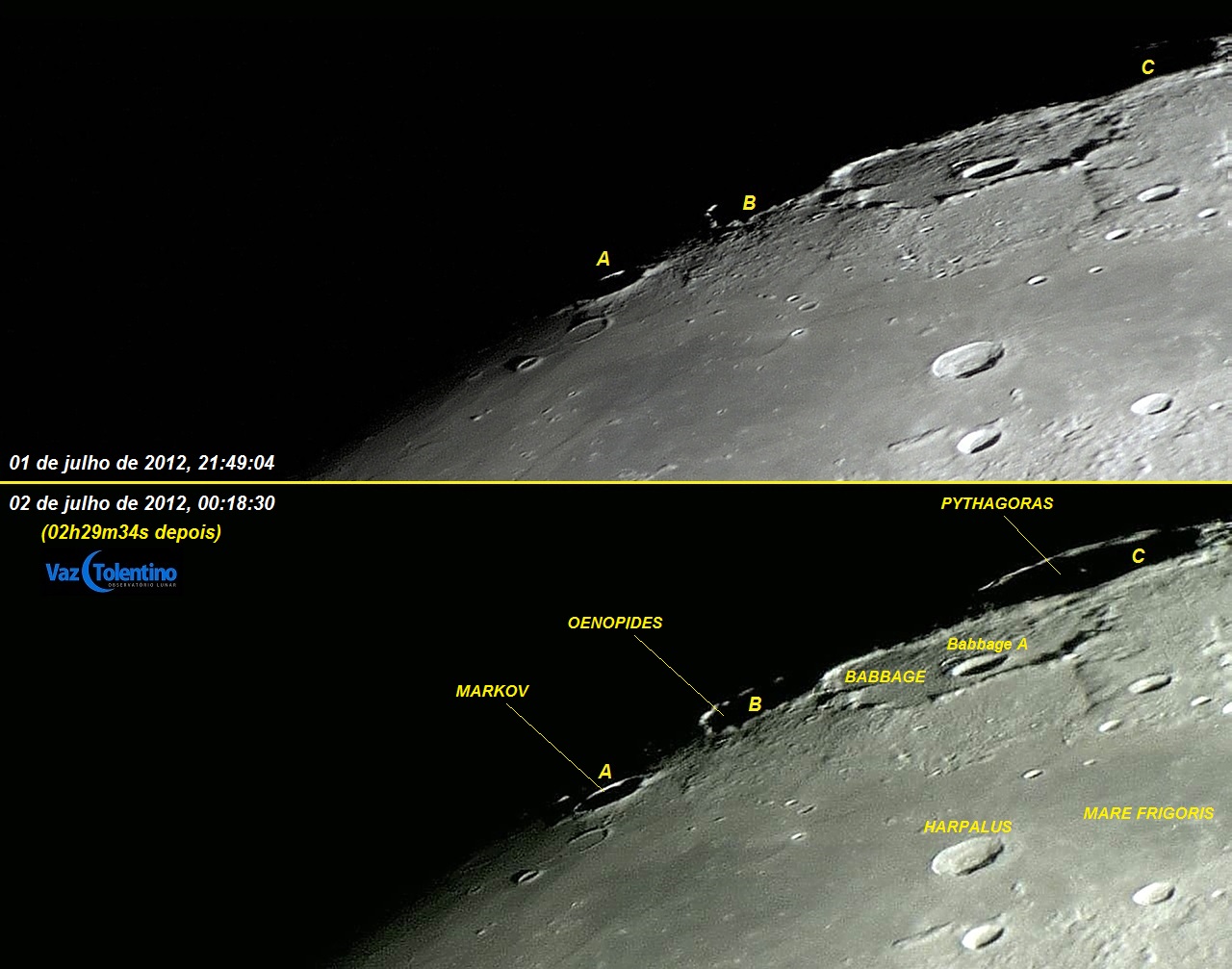 No caso da composição fotográfica de hoje, mostrando uma Lua crescente, quase chegando na fase cheia, as crateras (A) MARKOV, (B) OENOPIDES e (C) PYTHAGORAS, que estavam praticamente escondidas na escuridão da noite lunar na primeira foto (foto superior), num período de 2h29m34s entre uma foto e outra, já estavam com seus contornos quase que totalmente visíveis, inclusive com a cratera PYTHAGORAS mostrando a pontinha da sua montanha central iluminada.