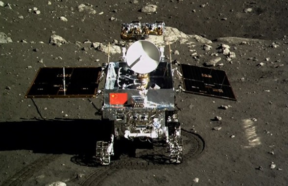 Foto: o veículo explorador robótico Yutu após o desembarque, já na superfície lunar.