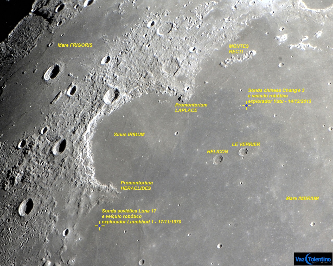 A data e hora oficial do pouso da sonda lunar chinesa Chang'e 3 na superfície poeirenta da Lua foi 14/12/2013, às 13:11:18 UT. A nave Chang'e 3 parece ter desembarcado um pouco a leste da área de alunissagem que estava prevista inicialmente. As coordenadas selenográfica aproximadas do local de alunissagem são: LAT: 44.12°N e LON: 19.51°W. Nessa região estão presentes estrias sinuosas e protuberantes, também definidas como cristas de enrugamento ou ondulações de lava basáltica solidificada, além de minúsculas crateras de impacto. Anteriormente, o local de alunissagem tinha sido definido como sendo no Sinus IRIDUM (baía do Arco-íris).