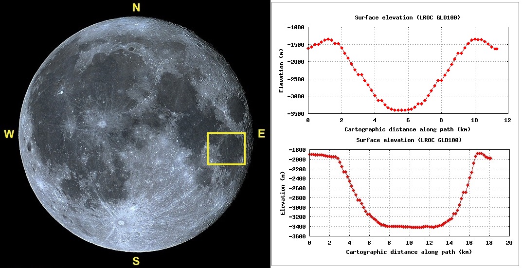 Foto: Lua cheia apresentando a área de abrangência da foto apresentada anteriormente, juntamente com os perfis altimétricos de MESSIER. O de cima na direção N – S e o de baixo na direção W – E.