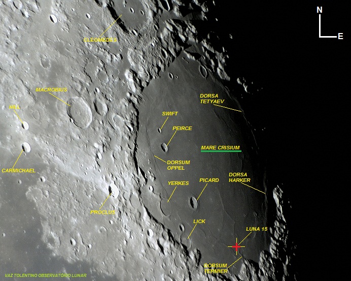 No interior do Mare CRISIUM, no lado sudeste, próximo à borda, foi o local onde a sonda da antiga União Soviética Luna 15 chocou-se com a Lua.