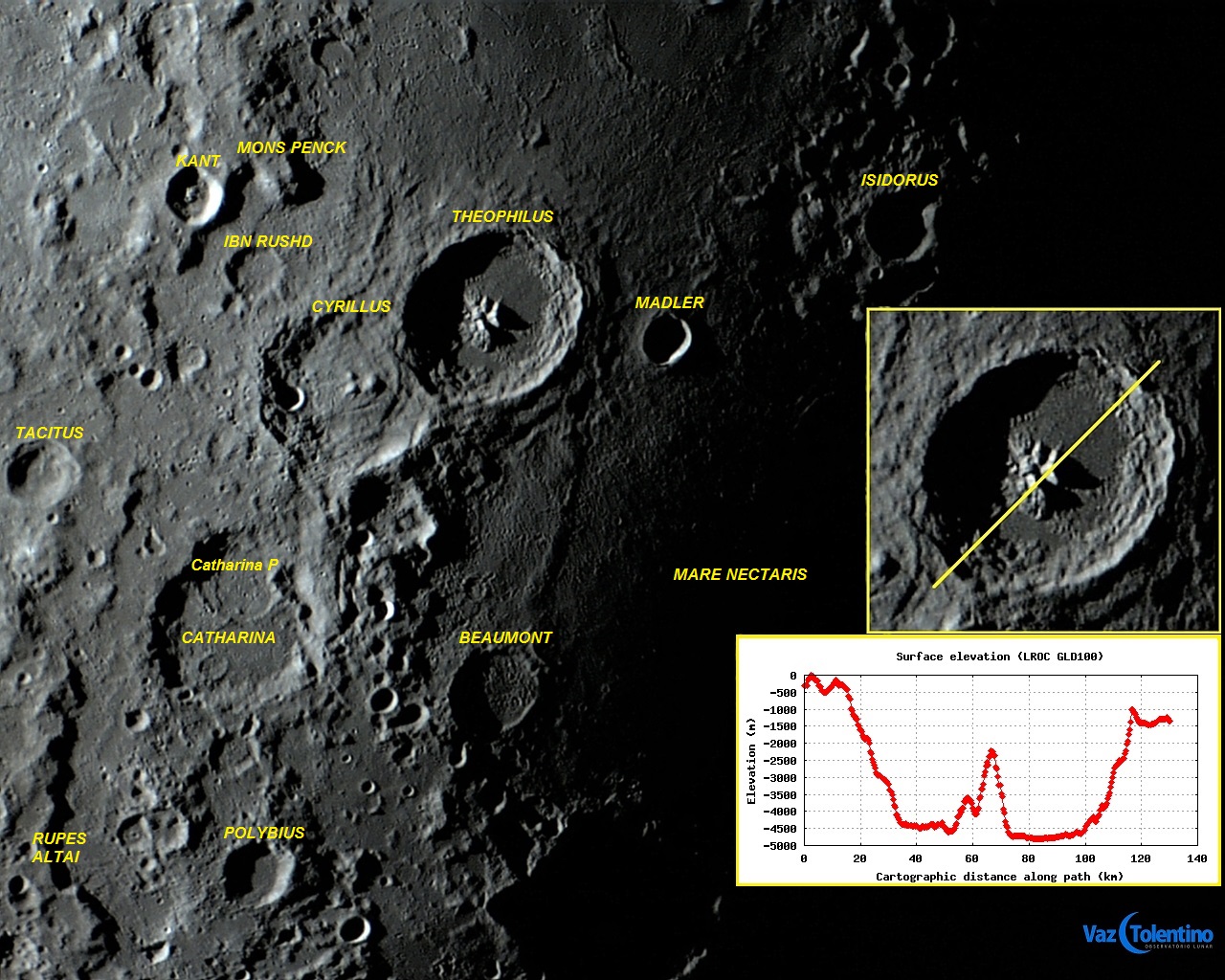 As crateras THEOPHILUS, CYRILLUS e CATHARINA formam um dos conjuntos mais interessantes para a observação telescópica. Esse destacado trio se localiza na margem oeste do Mare NECTARIS.