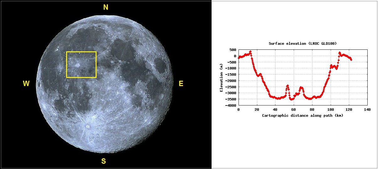 Foto: Lua cheia mostrando a área de abrangência da foto apresentada de COPERNICUS, ao lado do perfil altimétrico da bela cratera, com o traçado SW - NE.