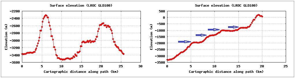 Ilustração: O perfil altimétrico dos picos centrais da cratera COPERNICUS e o perfil de uma seção de sua parede interna mostrando a estruturação em terraços (como se fossem degraus ou curvas de nível).