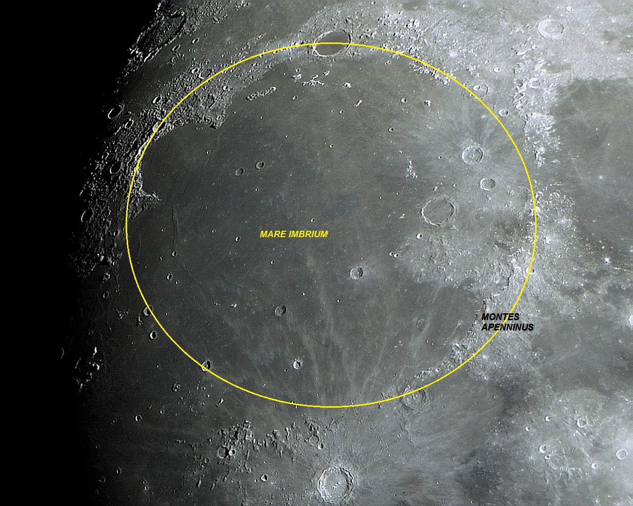 Na realidade, a cordilheira Montes APENNINUS é apenas uma pequena seção ou seguimento que marca a borda da vasta bacia IMBRIUM. Essa grande bacia depois foi inundada por lava e ficou conhecida como Mare IMBRIUM, que é o segundo mar de lavas da Lua (atrás apenas do Oceanus PROCELLARUM) e possui diâmetro da ordem de 1.200 km.