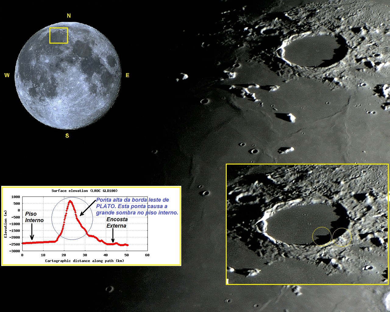 As longas sombras projetadas no piso interno liso de PLATO são causadas pelos altos e baixos existentes no perfil de seu aro. As longas sombras acontecem quando ocorre ângulo rasante de incidência da luz do Sol (amanhecer e entardecer). As longas sombras se estendem pela superfície do piso interno da cratera, criando um belo espetáculo visual. A foto mostra o amanhecer lunar em PLATO e as longas sombras são produzidas com a luz do Sol vinda do leste em ângulo oblíquo.