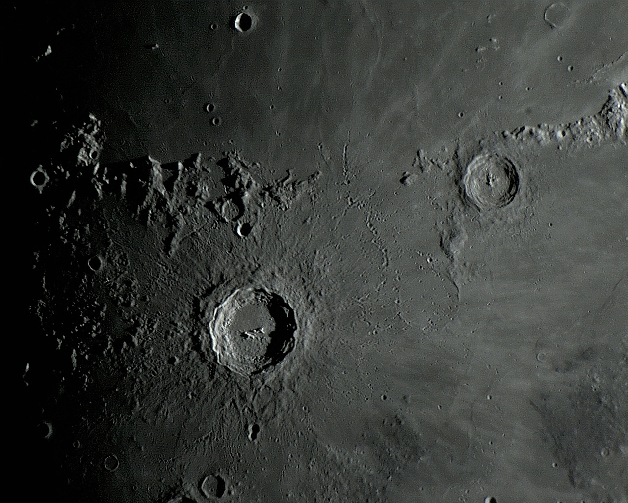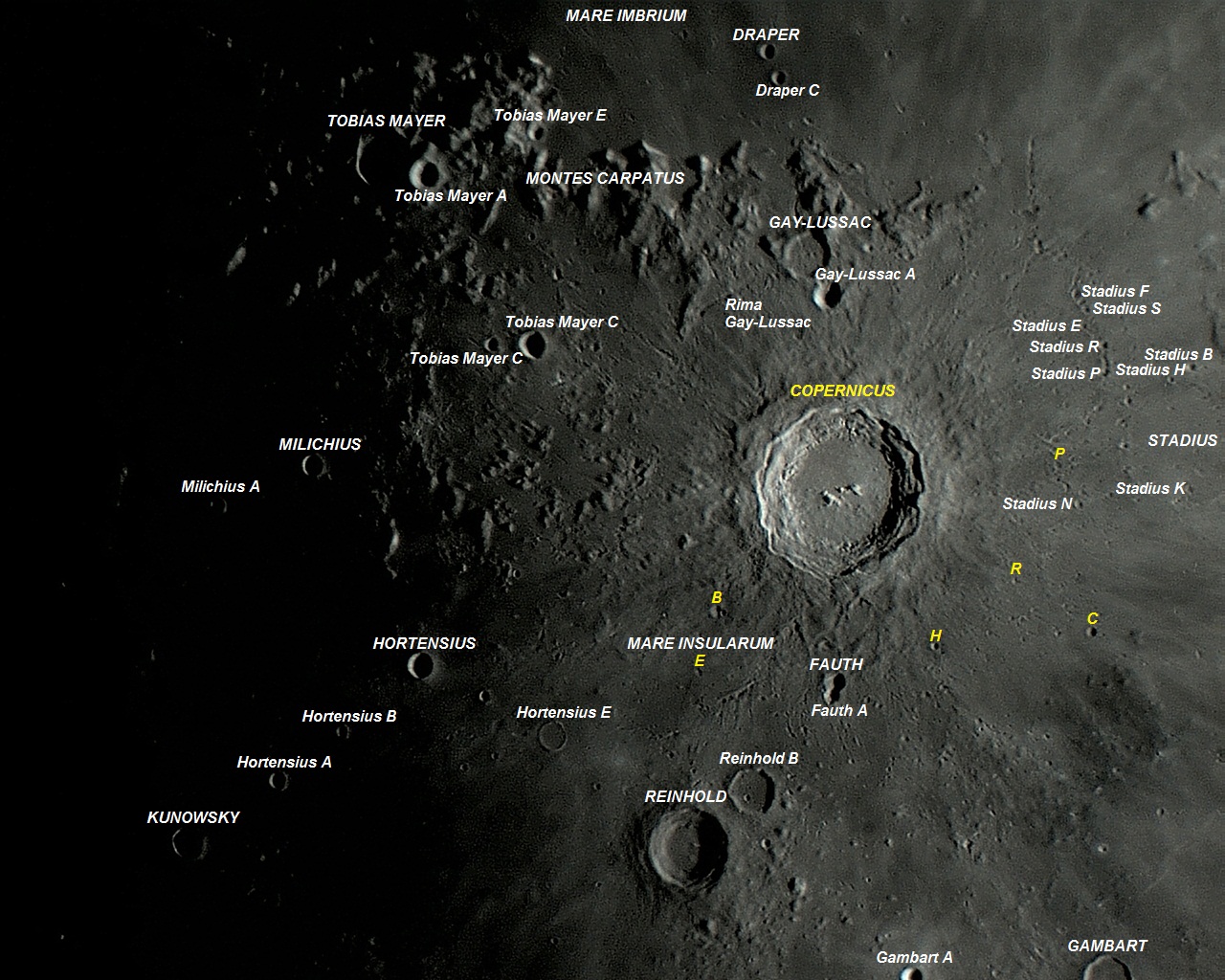 A proeminente COPERNICUS é um alvo fácil para telescópios e localiza-se ao sul do Mare IMBRIUM. COPERNICUS é uma espetacular cratera de impacto de morfologia complexa, com cerca de 800 milhões (alguns autores consideram 1 bilhão) de anos. Essa proeminente, interessante e jovem cratera possui um dos mais destacados sistema de “raios brilhantes” da Lua, que são trilhas de materiais mais recentes (com alto albedo ou refletividade da luz), criadas por sobre a superfície lunar, a partir dos escombros ejetados pelo enorme impacto que criou COPERNICUS. Os raios brilhantes se estendem por até 700 Km em todas as direções, através dos mares de lava circundantes.