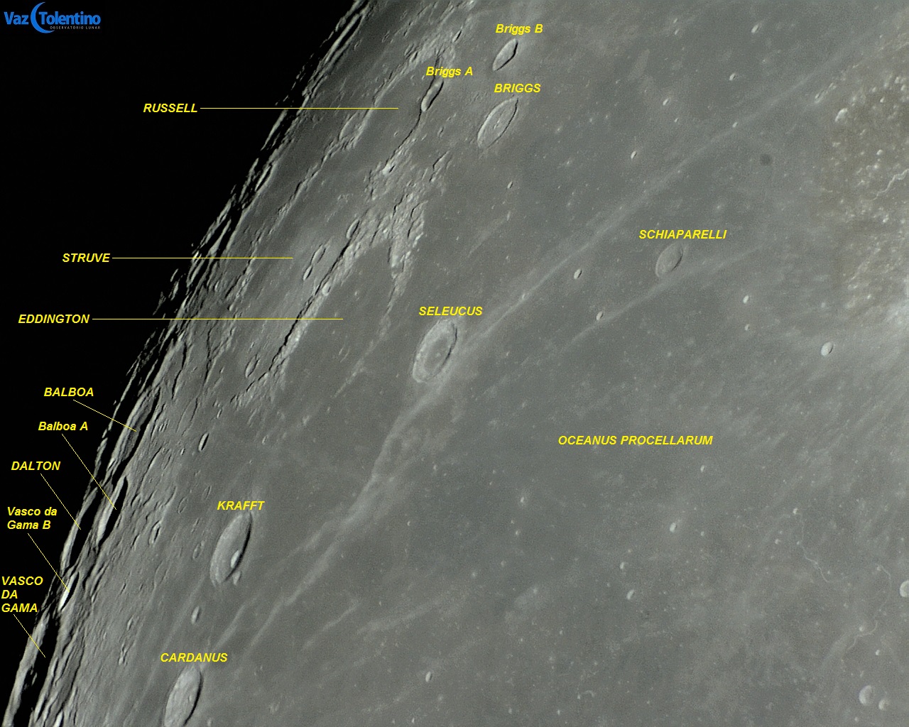 Três belas planícies muradas (crateras amplas): RUSSELL, STRUVE e EDDINGTON, localizadas próximas ao limbo noroeste lunar, com diâmetros de 103 Km, 164 Km e 120 Km respectivamente. São antigas formações, todas do período Pré-Nectárico (de 4,55 bilhões até 3,92 bilhões de anos atrás) com paredes muito desgastadas e extensos pisos lisos e planos, inundados por lavas escuras do Oceanus PROCELLARUM, que hospedam alguns impactos de crateras menores. O melhor período para observação é no sexto dia após ao quarto-crescente ou no quinto dia após o quarto-minguante.