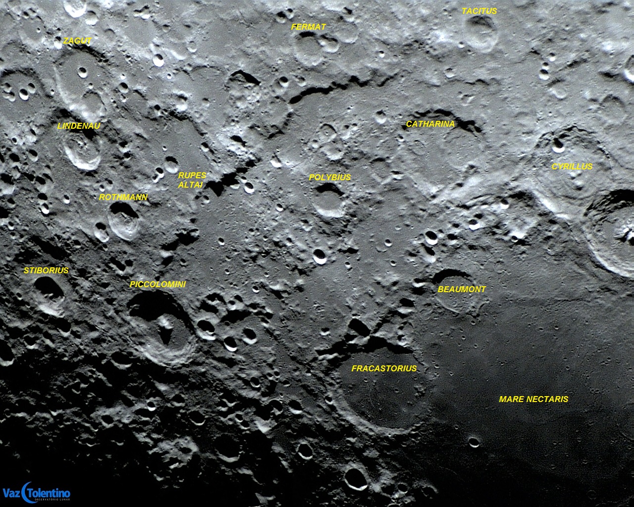 Os arcos concêntricos em amarelo estão representando parte dos anéis da bacia NECTARIS. O mar de lavas propriamente dito (Mare NECTARIS) concentrou-se apenas na área interna do anel central. Os anéis dessa bacia foram suplantados por impactos subsequentes, que “camuflaram” suas existências, sobrando apenas algumas pistas, como a grande escarpa curvilínea Rupes ALTAI (480 Km de extensão), na borda do arco maior.