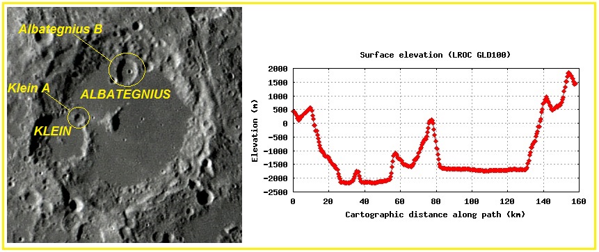 Ilustração: A cratera ALBATEGNIUS com seu piso plano e liso, que hospeda as crateras KLEIN e Albategnius B. O perfil altimétrico SW – NE abrangendo KLEIN e ALBATEGNIUS também é apresentado.