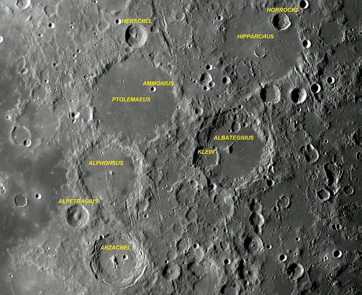 Foto: O belo conjunto de crateras PTOLEMAEUS, AMMONIUS, ALPHONSUS, ARZACHEL, ALPETRAGIUS, ALBATEGNIUS, KLEIN, HIPPARCHUS, HORROCKS e HERSCHEL, situadas próximas do centro do disco lunar da face visível. Foto executada com apenas 1 frame em 01 de maio de 2013, 03:38:36 (06:38:36 UT).