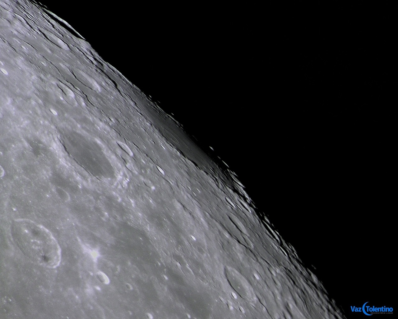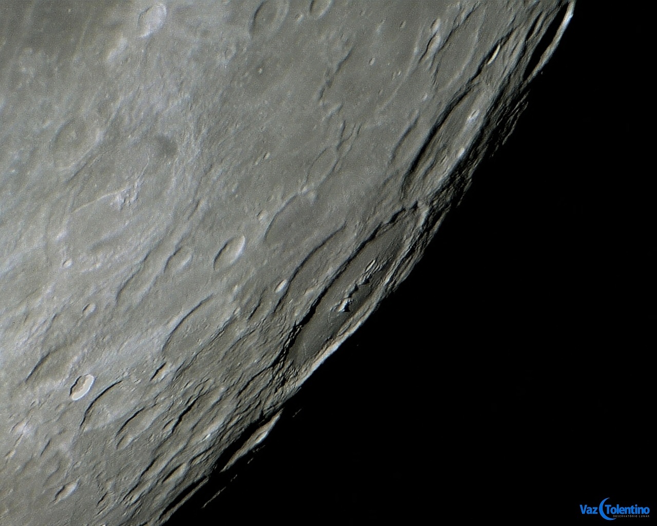 Foto: Imagem do Mare Humboldtianum de lavas escuras e sua grande bacia, localizados no limbo lunar nordeste. Observe o anel externo da bacia. Foto executada com apenas 1 frame em 08 de outubro de 2014, 22:41:38 (01:41:38 UT).