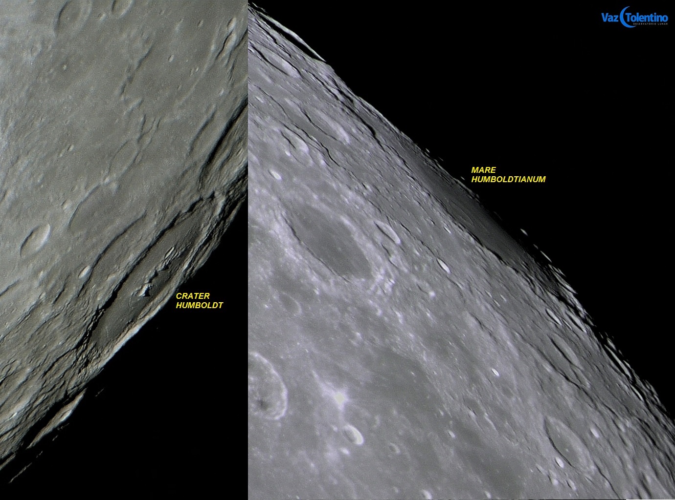 No entanto, o irmão que foi um grande educador, recebeu como homenagem uma bela cratera de morfologia complexa, podemos dizer também completa, cheia de características, com 189 km de diâmetro (Cratera Humboldt). Imagens feitas pela sonda espacial LRO da NASA mostram que essa cratera tem seu piso interno inundado por lava, com partes lisas e planas, mas também tem partes ásperas. O piso também apresenta depósitos escuros de material piroclástico (cinzas vulcânicas). O piso interno também abriga alguns impactos de pequenas crateras, incluindo uma cratera concêntrica perfeita. A grande Cratera Humboldt também apresenta um conjunto de canais (rilles) concêntricos e radiais, uma cadeia de montanhas centrais, paredes internas estruturadas em terraços (terraces) e borda externa contornada por baluarte (rampart). Logo, uma cratera complexa que parece um “parque temático”, que apresenta várias características e detalhamentos, seria um excelente objeto de estudo em sala de aula para o irmão educador.