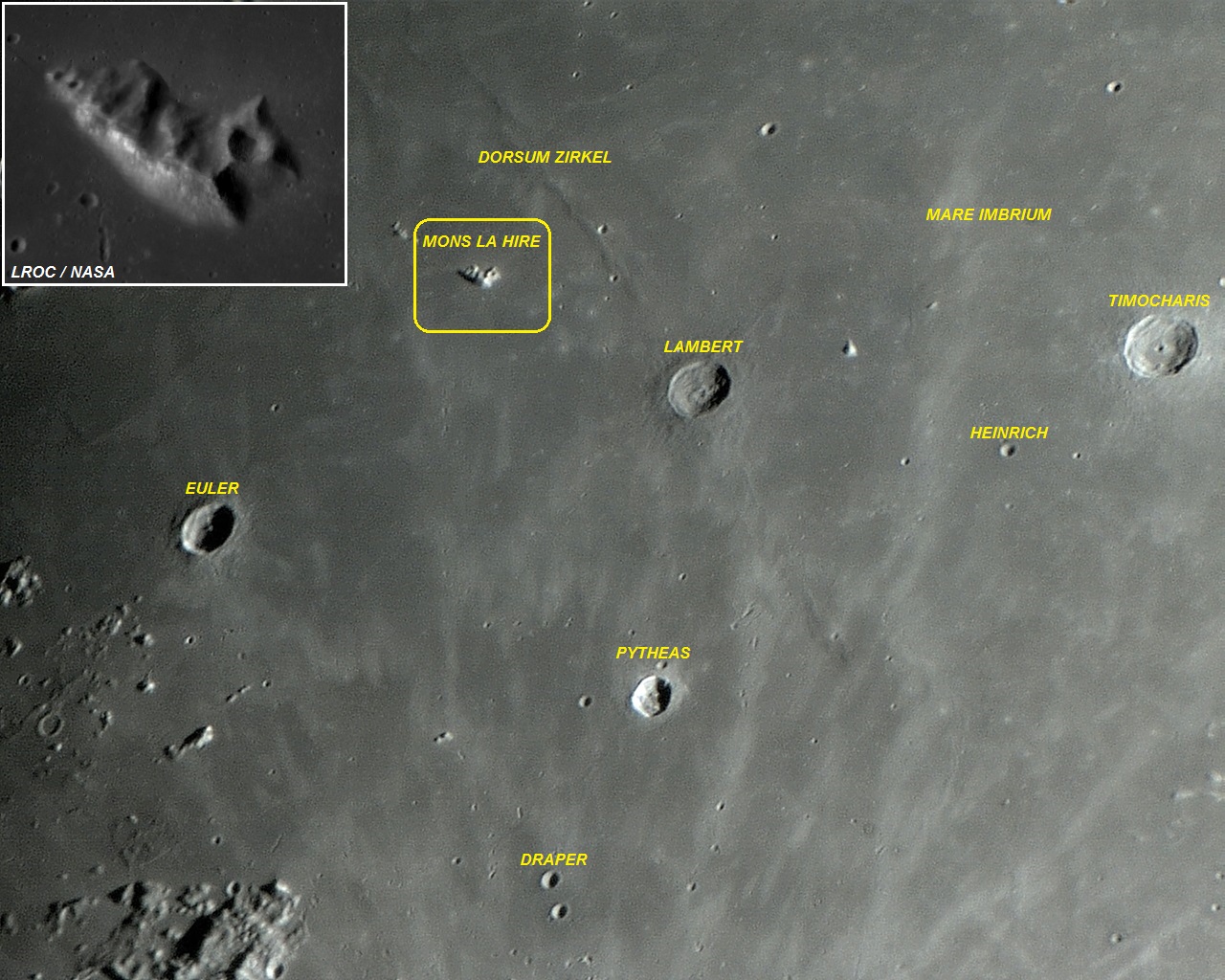 Mons LA HIRE é uma montanha isolada no Mare IMBRIUM, como se fosse um rochedo ou uma ilha, com superfície apresentando alta taxa de albedo (reflexão de luz), localizada a noroeste da Cratera LAMBERT (cerca de 85 Km desta) e a nordeste da Cratera EULER (cerca de 140 Km desta).