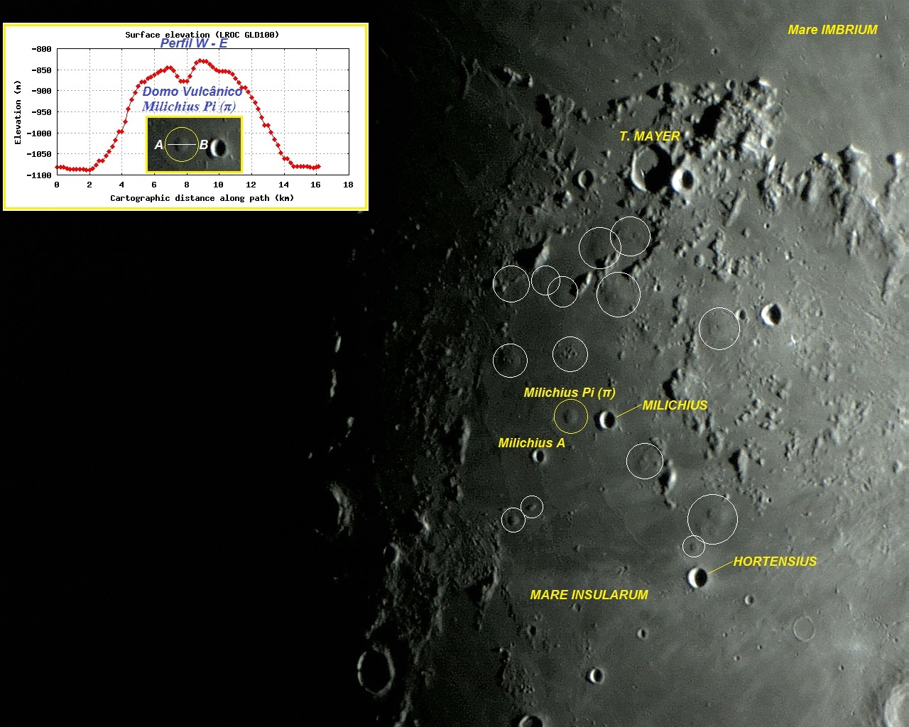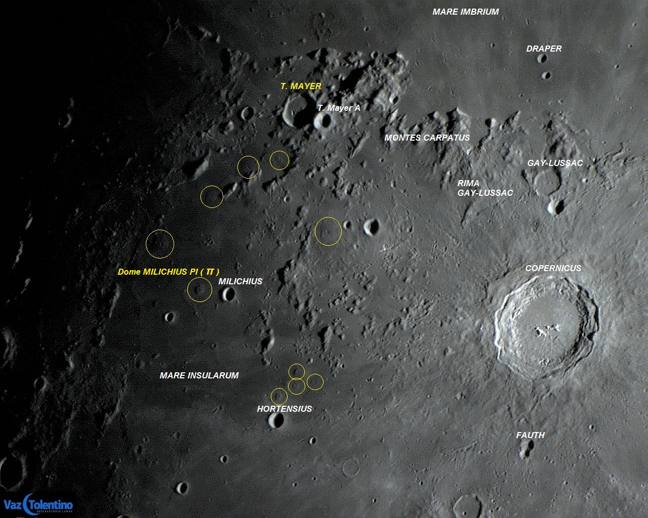 A região abaixo (ao sul) da cratera TOBIAS MAYER (ou T. MAYER) (diâmetro: 33 Km, profundidade: 2,9 Km) na área do Mare INSULARUM, contém muitas cúpulas ou domos vulcânicos (antigos vulcões - veja os círculos nas fotos abaixo), que preservam suas antigas características físicas. A principal dessas características é a caldeira central, através da qual o magma viscoso era expelido (vulcanismo extrusivo). Os domos vulcânicos são formações muito rasas e só podem ser observados quando existe a incidência de luz solar em ângulo muito baixo (amanhecer ou anoitecer lunar).