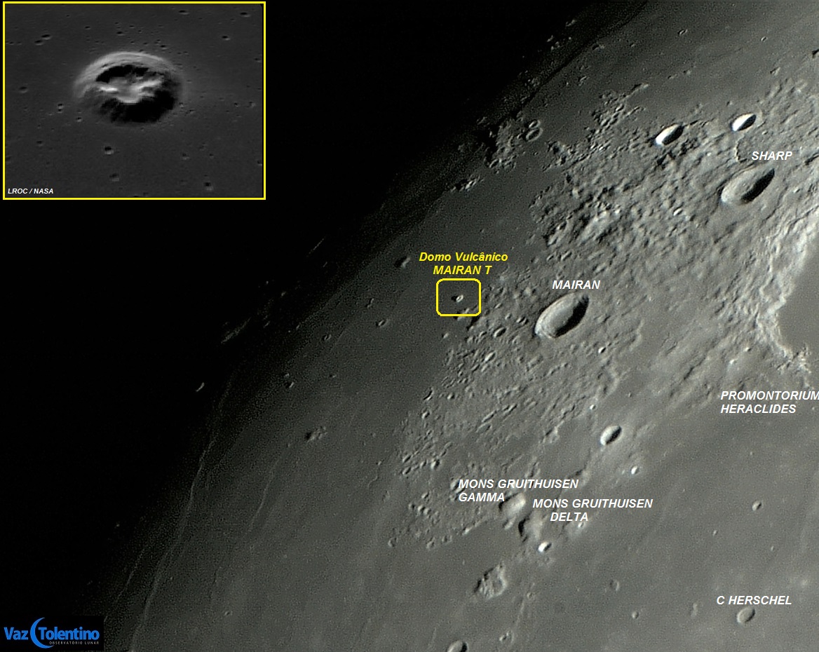 "Dome Mairan T" é um antigo vulcão lunar, que apresenta cone brilhante e destacado (alto albedo). Sua superfície clara indica que esse domo vulcânico foi formado por lavas ricas em sílica que são diferentes e muito mais viscosas do que o basalto escuro tradicional, rico em ferro, existentes nos mares lunares.