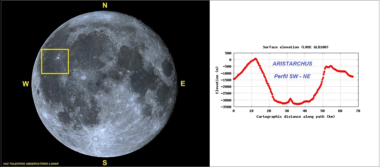 Ilustração: Lua cheia apresentando a região da foto da cratera ARISTARCHUS e seu platô. Ao lado está o perfil altimétrico W – E da cratera ARISTARCHUS.