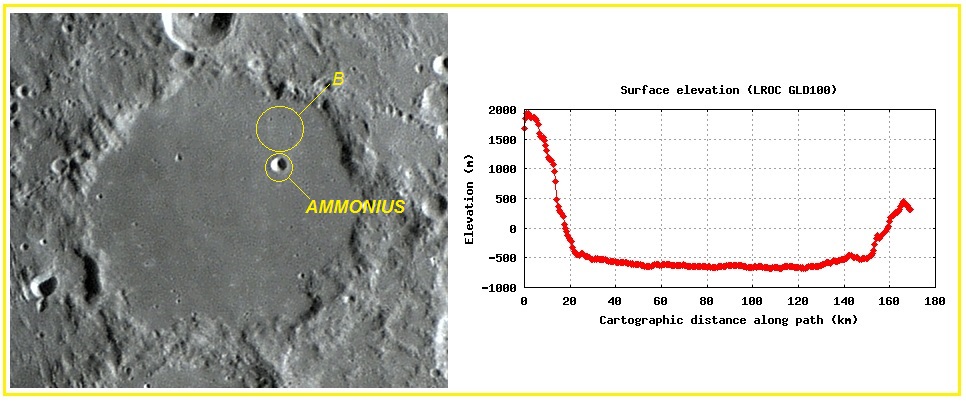 IlustraçãoA enorme cratera PTOLEMAEUS, que hospeda em seu amplo piso plano, as crateras AMMONIUS e Ptolemaeus B (fantasma). O perfil altimétrico N – S de PTOLEMAEUS também é apresentado.