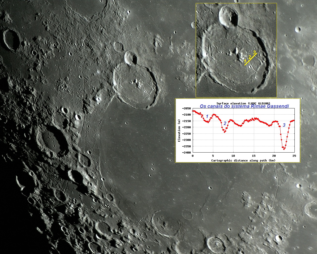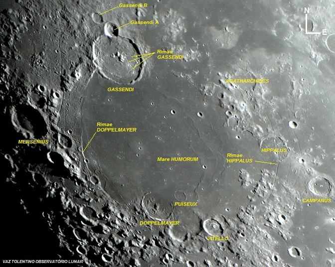 GASSENDI – Cratera com 110 Km (69 milhas) de diâmetro. Lat: 17.6º S Long: 40.1º W.