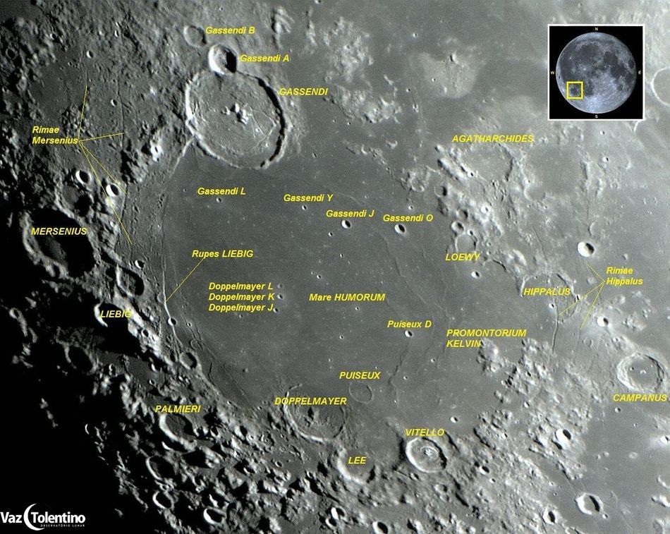 Mare Humorum (Mar da Umidade) está entre os menores mares (ou “maria”) da Lua. Seu perímetro é “pavimentado” por lava basáltica escura, rica em ferro e magnésio, sendo visível a olho nu e facilmente identificável quando a Lua estiver próxima da fase “Lua Cheia”. Também é facilmente definida com o uso de telescópio, pois é contornada por montanhas e crateras brilhantes. O arco de montanhas define uma bacia quase circular com 425 Km (265 milhas) de diâmetro.