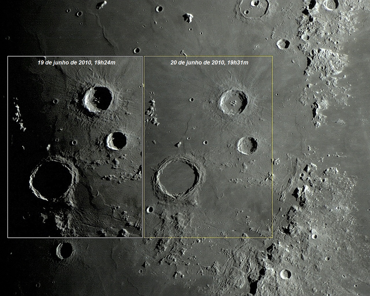 Composição fotográfica executada com apenas 1 frame em 19 de junho de 2010 (19:24 LT; 22:24 UT) e 20 de junho de 2010 (19:31 LT; 22:31 UT).