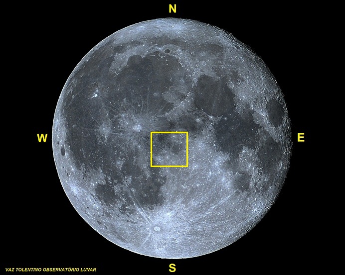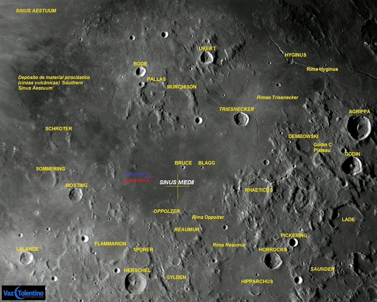 Sinus MEDII - o centro do disco visível da Lua (Lat: 0o N, Lon: 0o E).