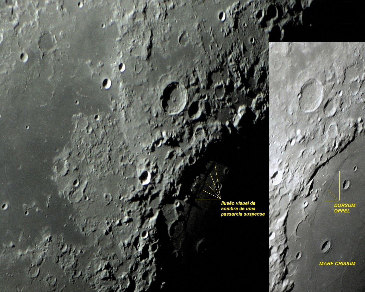 Dorsum OPPEL é uma longa crista de perfil baixo ou pouco destacado, em forma de arco de círculo, que acompanha internamente a borda oeste do Mare CRISIUM. Porém, apesar do pouco destaque de seu dorso, mas devido a um desnível em torno de 200m em seu perfil, grandes sombras são projetadas no piso interno de Mare CRISIUM, quando a luz solar incide obliquamente sobre a região (nesse caso em particular, o entardecer lunar). Essas sombras, quando combinadas com aquelas derivadas das ondulações das estruturas das montanhas da borda de Mare CRISIUM, criam uma ilusão visual, como se fosse a sombra de um viaduto ou passarela suspensa (veja indicação na imagem abaixo).