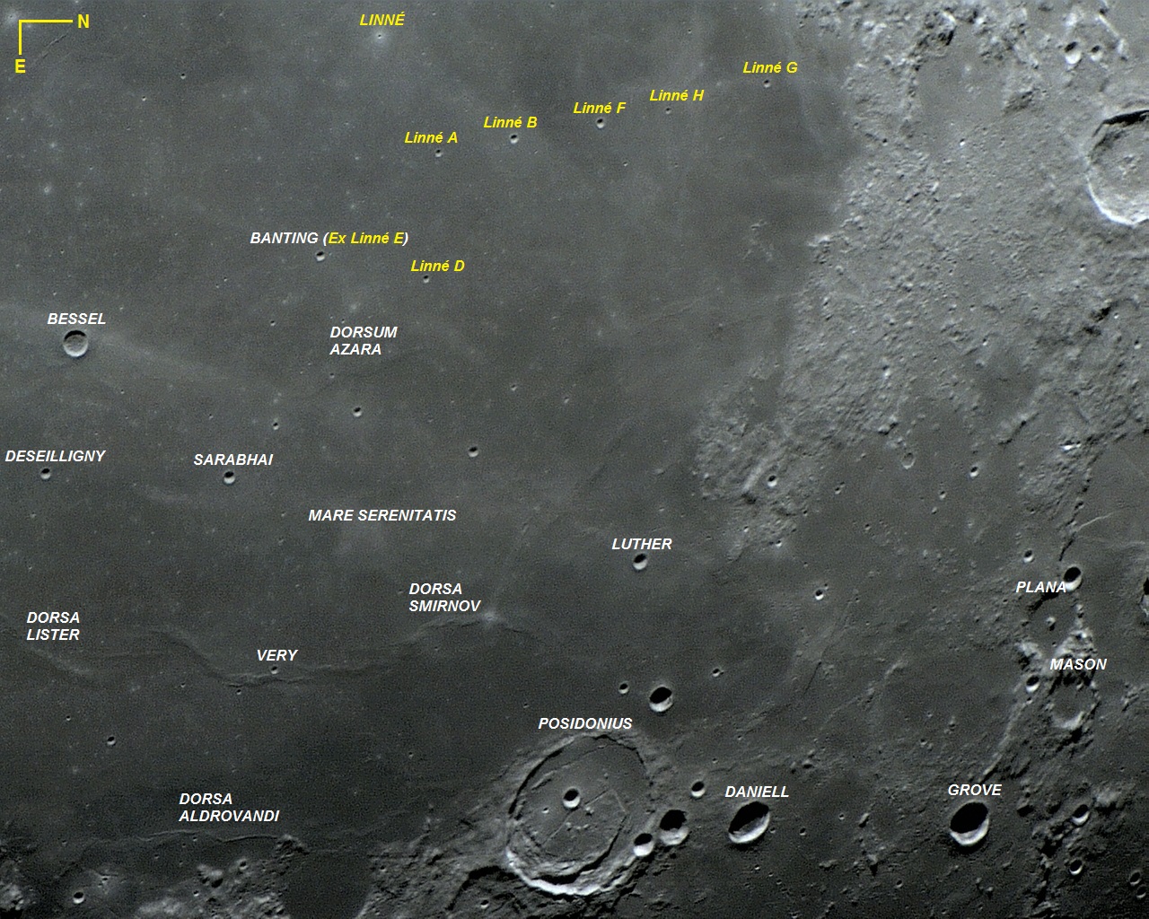 Foto: A minúscula cratera LINNÉ e sua família, compostas pelas crateras Linné G, H, F, B, A e D, todas pequenas e alinhadas (exceto Linné D). A grande e proeminente cratera de piso fraturado é POSIDONIUS, com 101 Km de diâmetro. Foto executada com apenas 1 frame por VTOL em 22 de fevereiro de 2011, 02:06:54.