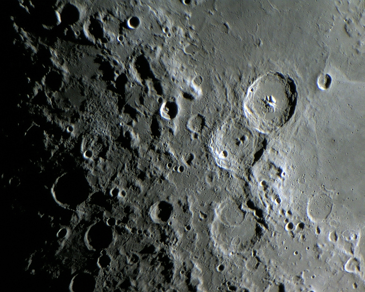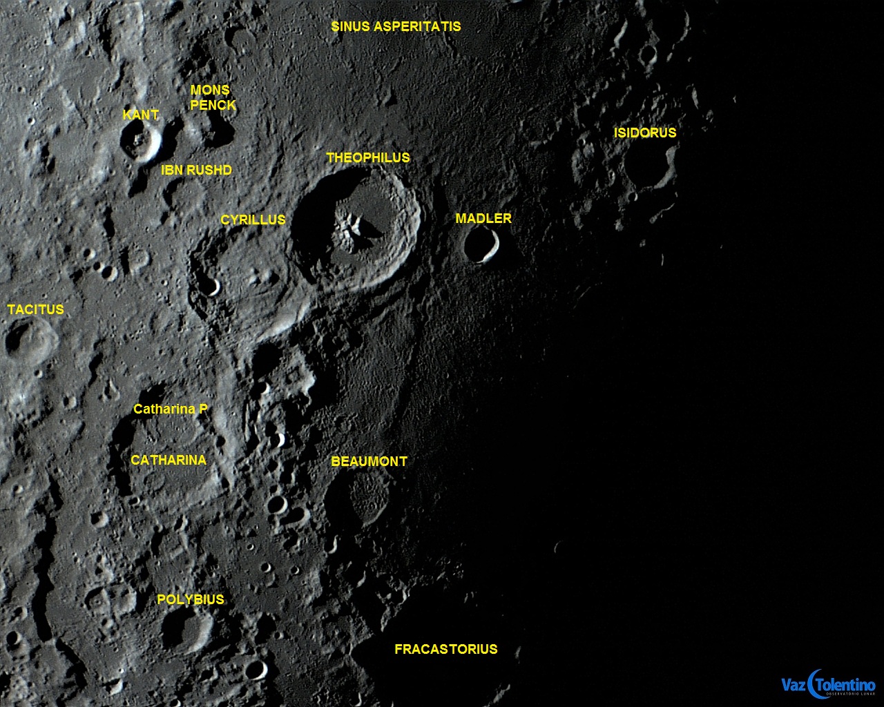 As crateras THEOPHILUS, CYRILLUS e CATHARINA formam um dos conjuntos mais interessantes e marcantes para a observação telescópica. Esse destacado trio se localiza na margem oeste do Mare NECTARIS, no quadrante sudeste lunar. As três crateras tem aproximadamente o mesmo diâmetro, próximo dos 100 Km.