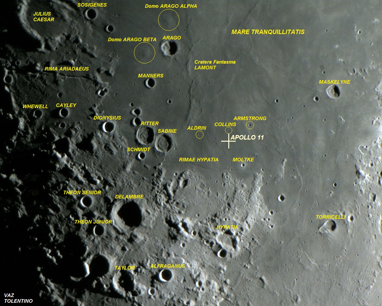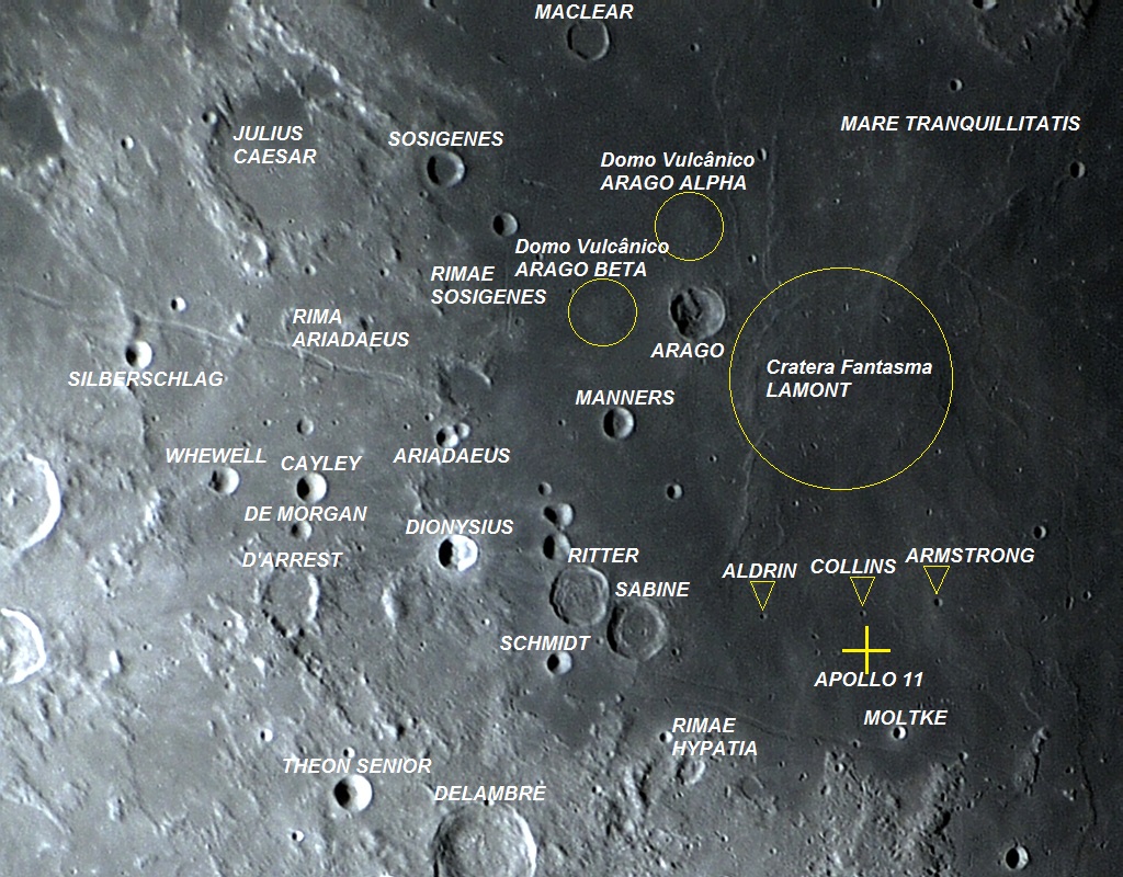 Foto: Uma visão ampla da região que foi alvo da alunissagem da missão Apollo 11, mostrando algumas crateras de interesse. O pouso suave da primeira missão tripulada na superfície lunar, aconteceu no Mare TRANQUILLITATIS, nas coordenadas selenográficas LAT: 00° 40′ 26.69″ N, LON: 23° 28′ 22.69″ E, em 20 de julho de 1969, às 20:17:40 UT. Foto executada com apenas 1 frame em 22 de fevereiro de 2011, 02:28:50.