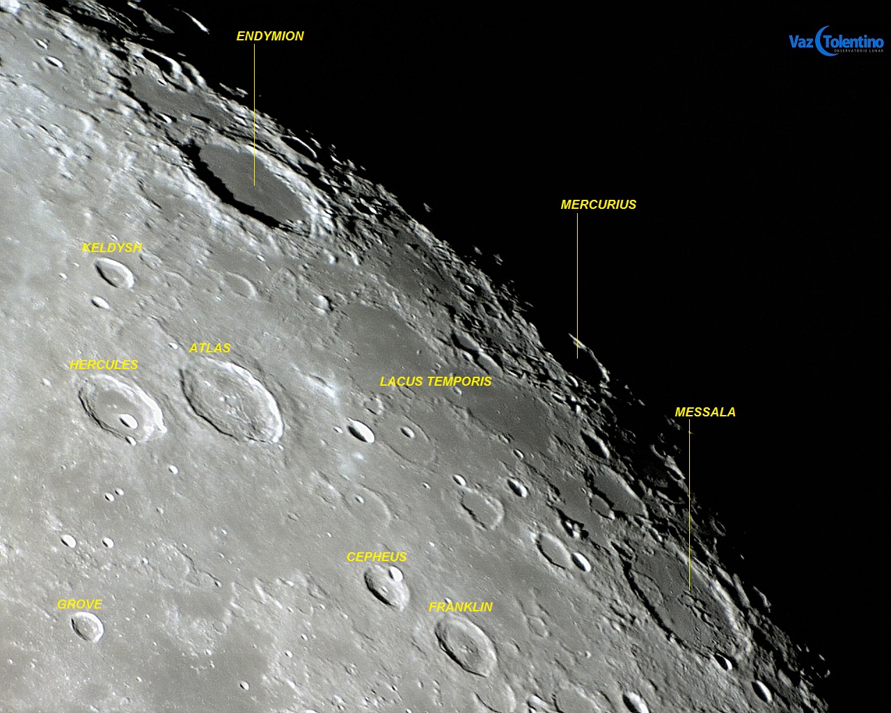 Foto: A grande cratera de piso escuro e liso ENDYMION próxima do limbo nordeste lunar. Apesar de seu formato verdadeiro ser circular, apresenta-se oval perante nosso ponto de vista a partir da Terra. Nessa composição apresenta-se também, o perfil altimétrico N – S de ENDYMION. Foto executada com apenas 1 frame em 10 de março de 2012, 00:56:12 (03:56:12 UT).