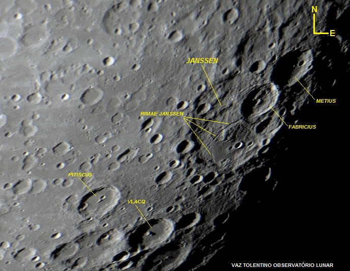 Mais abaixo, cerca de 100 Km do lado sudoeste de Janssen encontra-se a proeminente cratera de impacto Vlacq (diâmetro: 89Km; profundidade: 3,8 Km; LAT: 53.3º S e LON: 38.8º E). É uma cratera de formação circular com paredes altas, estruturadas internamente em forma de degraus ou curvas de nível (terraces). Seu piso interno é plano (inundado por lava), apresentando montanha central com 2 picos, originada pela reação do piso ao impacto que a criou.