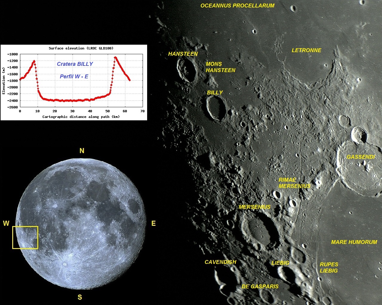 Foto: Composição mostrando o perfil altimétrico da cratera BILLY e a localização da foto apresentada na Lua cheia. A cratera BILLY com sua vizinha HANSTEEN e Mons HANSTEEN de formato triangular, também são mostrados. Foto executada por VTOL em 21 de maio de 2013, 22:43:14.