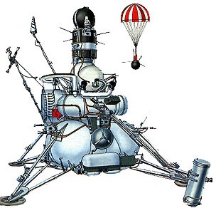 Ilustração: A sonda robótica soviética Luna 20, da mesma classe de sua antecessora Luna 16, e o esquema de retorno e aterrissagem em território soviético, utilizando paraquedas (http://astro-notes.org/sondes_extra_terrestres.htm- acessado em 12/02/2016).