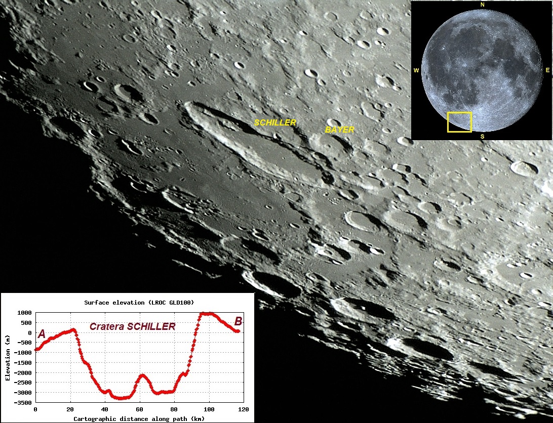 Foto: A estranha e diferenciada cratera SCHILLER, localizada no quadrante sudoeste lunar, com dimensões em torno dos 179 Km X 71 Km. SCHILLER pode ter sido criada por três ou mais projéteis (fragmentos de um mesmo cometa ou asteroide) que atingiram a superfície lunar praticamente ao mesmo tempo e em ângulo baixo. O perfil transversal da metade noroeste de SCHILLER (onde existe a crista que divide o piso em duas metades) é apresentado. A abramgência da foto na Lua cheia também é apresentado. Fotos e perfis por VTOL. Foto executada em 21 de maio de 2013, 21:58:22 (00:58:22 UT).
