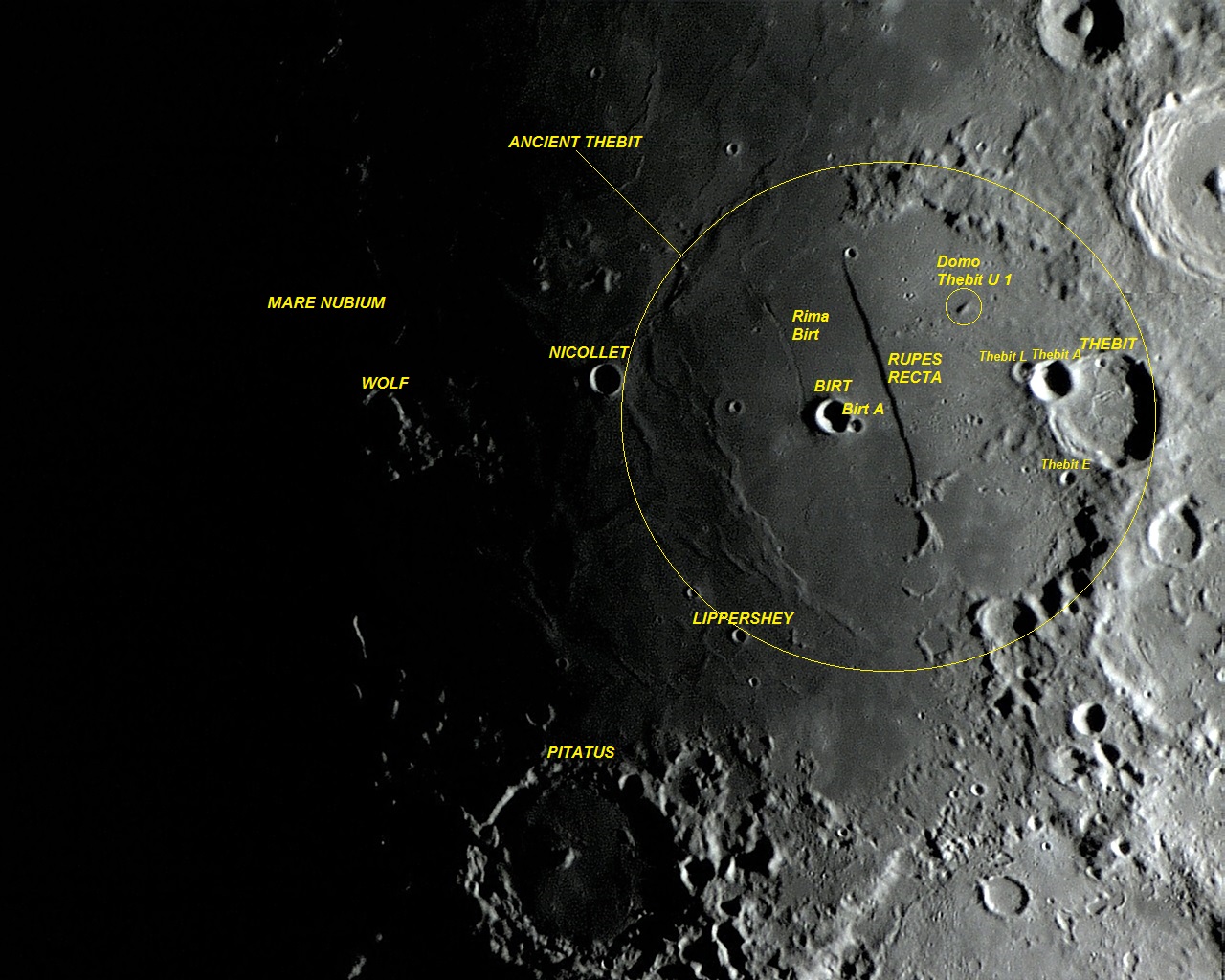 Do lado leste de Rupes Recta está a cratera Thebit (diâmetro: 56 Km, Lat: 22.0º S Long: 4.0º W), com a menor Thebit A (diâmetro: 20 Km) sobre sua parede do lado noroeste. Esta cratera menor por sua vez, hospeda a ainda menor Thebit L (diâmetro: 12 Km) em sua borda também noroeste.