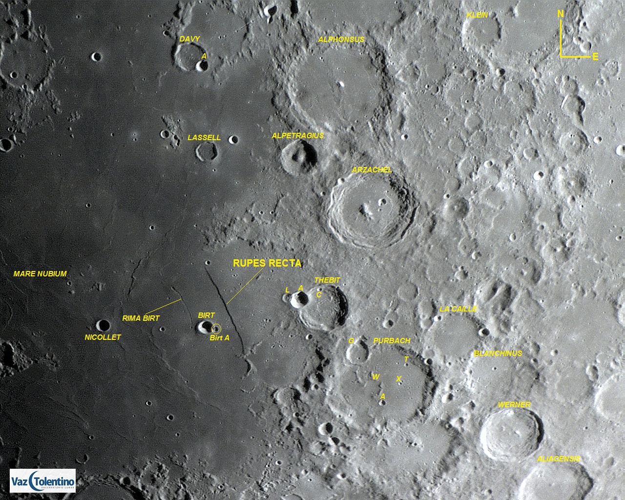 Do lado oeste de Rupes Recta existe a cratera Birt (Lat: 22.4º S Long: 8.5º W) com seus 16 Km de diâmetro. Sobre a parede leste de Birt, encontra-se a pequena cratera Birt A.
