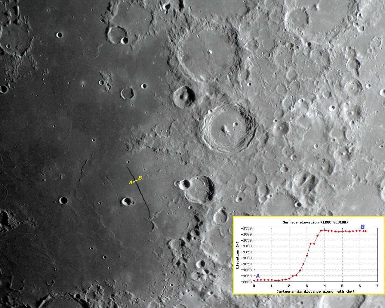 A nordeste de Rupes Recta encontra-se a cratera Arzachel (diâmetro: 96 Km, Lat: 18.2º S Long: 1.9º W), com 3,6 Km de profundidade e pico central de 1,5 Km de altitude.