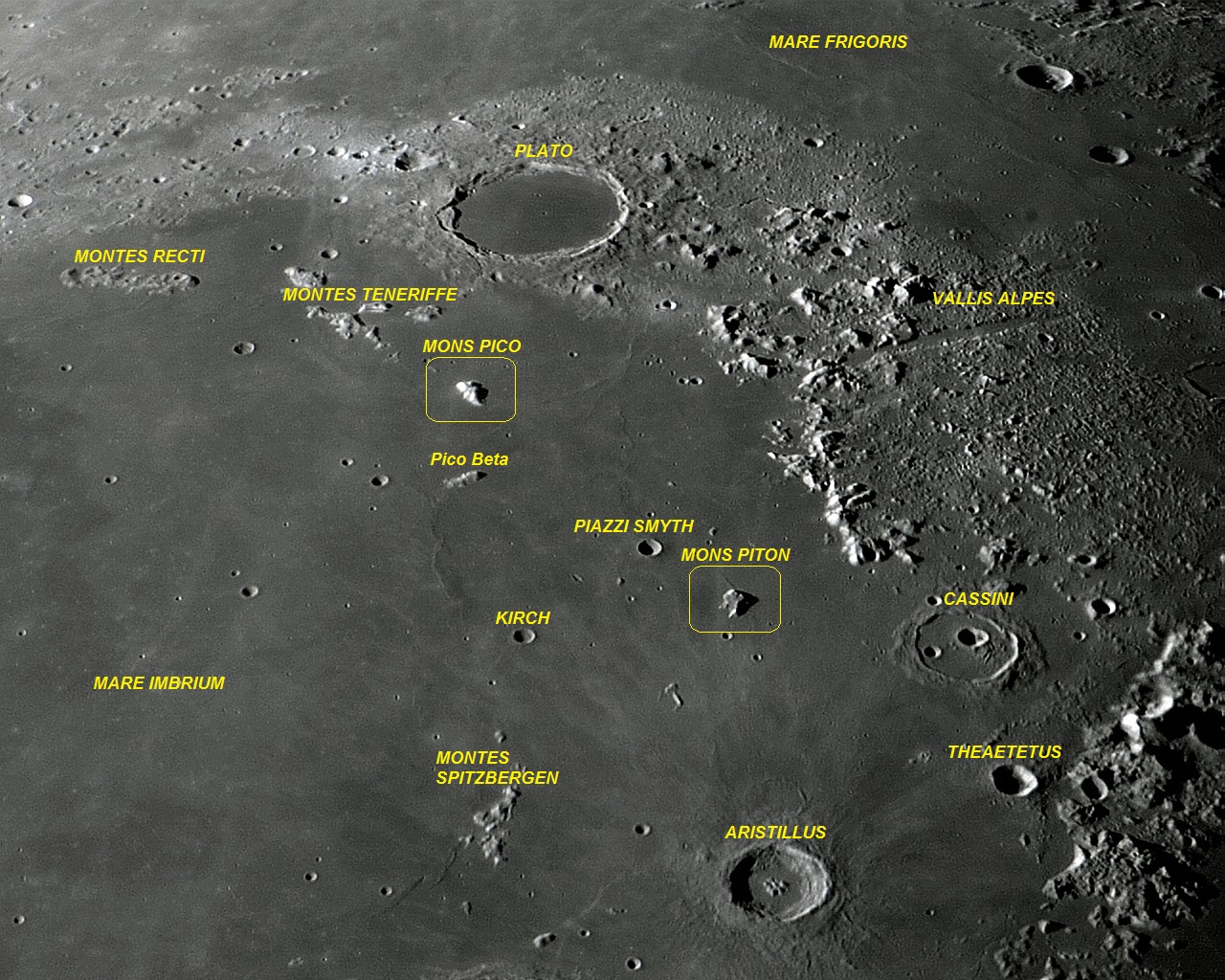 Mons PICO é uma destacada montanha ou “rochedo” isolado que emerge das lavas do Mare IMBRIUM, orientado longitudinalmente na direção noroeste-sudeste, com altitude máxima de 2,47 Km e ocupando uma área de 15 Km x 30 Km em sua base. Possui superfície bastante refletiva (alto albedo), destacando-se muito em relação ao mar de lava escura que o circunda. Quando iluminado obliquamente pelo Sol, Mons PICO projeta longa sombra sobre a superfície lisa circundante.