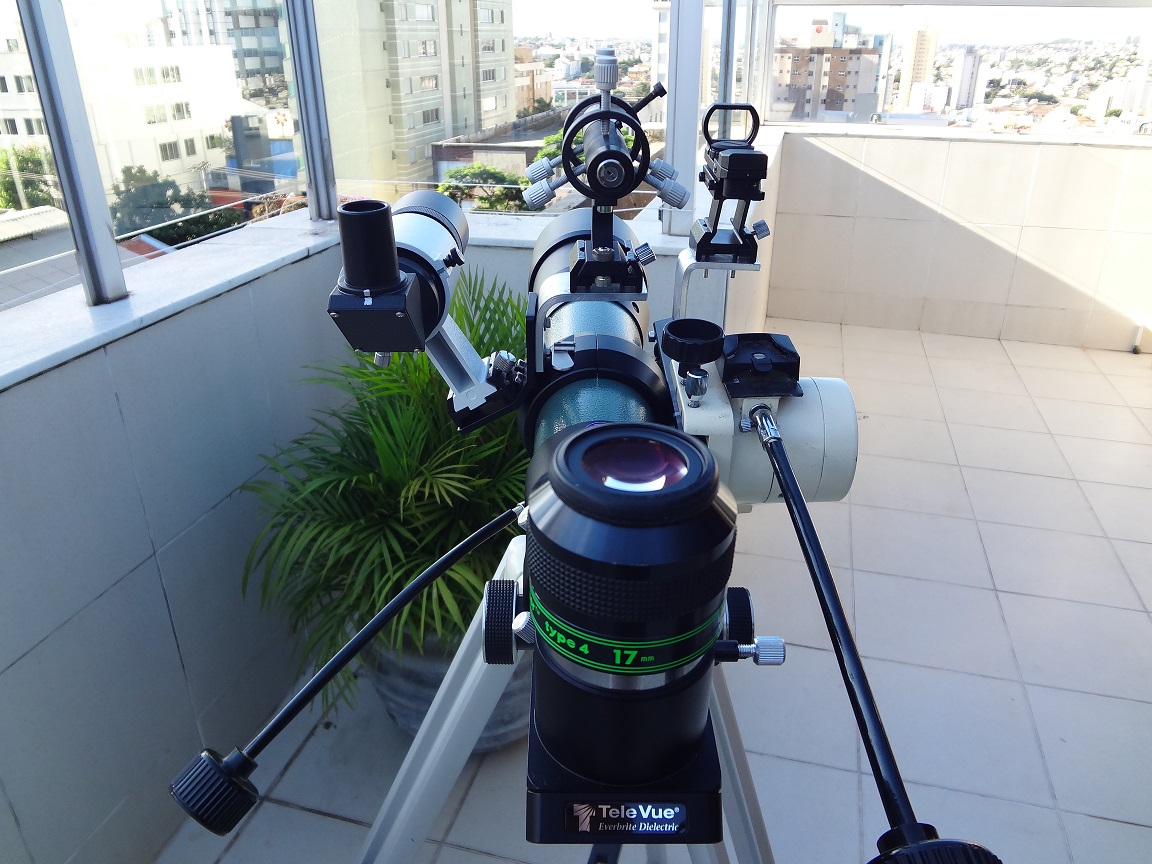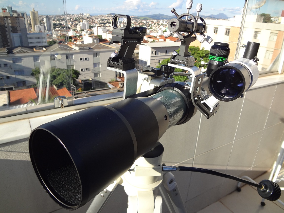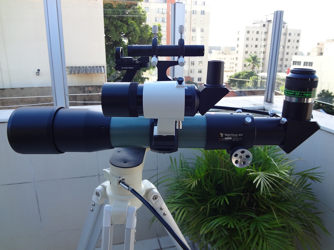 Objetivando utilizar o telescópio refrator APOcromático Tele Vue 85 (TV-85) tanto de noite, quanto de dia, aproveitando assim o máximo da qualidade desse excelente equipamento, resolvi adaptar 3 tipos de miras. Durante décadas pratiquei tiro esportivo e participei de muitas provas de tiro ao alvo e tiro prático. Por isso, sempre gostei muito de uma mira, o que é fundamental na Astronomia Observacional, quando se busca um alvo camuflado no céu noturno.
