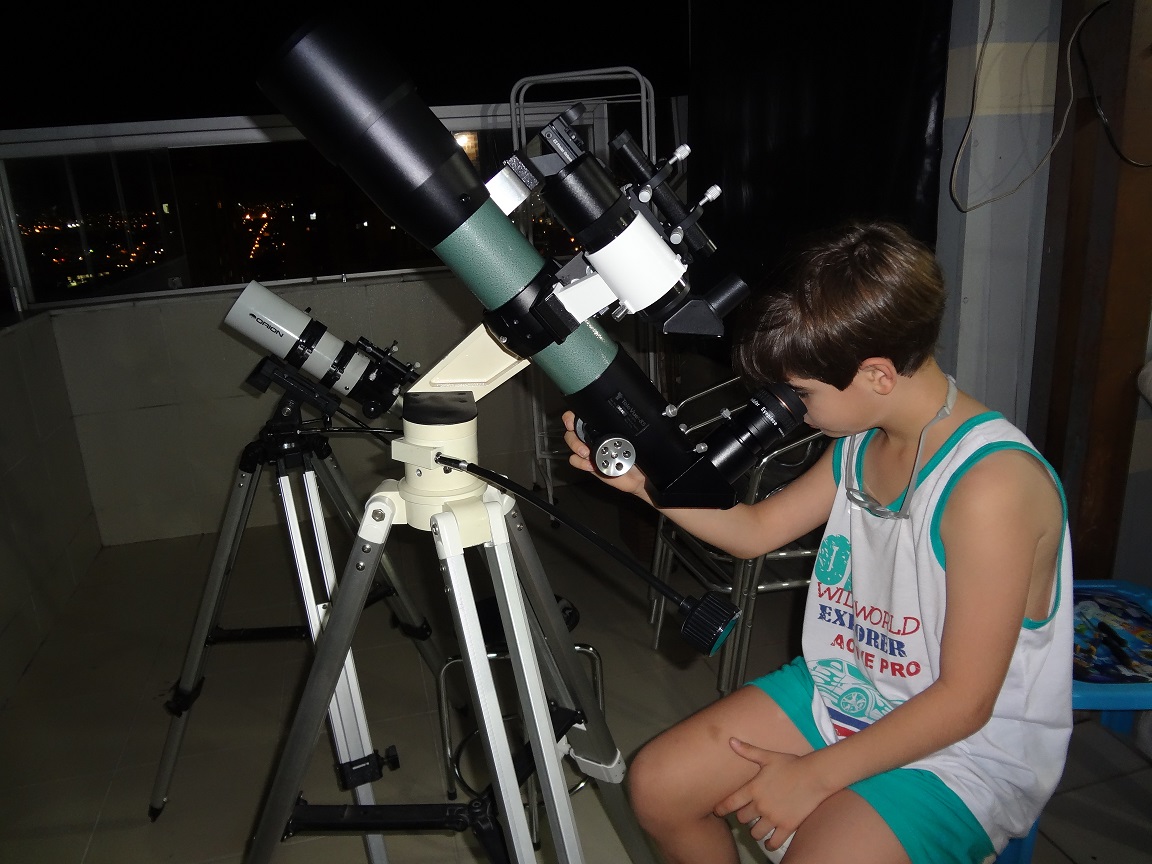 Foto: O pequeno astrônomo amador Rodrigo Tolentino observando com o Tele Vue 85.