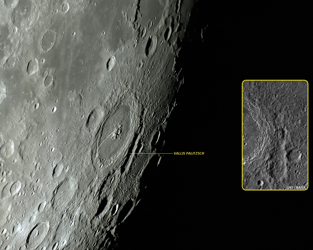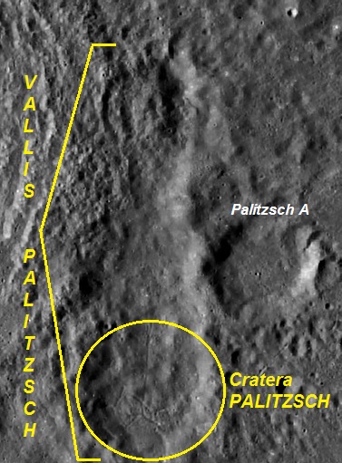 Imagem: O extenso Vallis PALITZSCH fotografado pela sonda lunar rpbótica LRO da NASA. A Cratera PALITZSCH e a Cratera Palitzsch A também são mostradas.