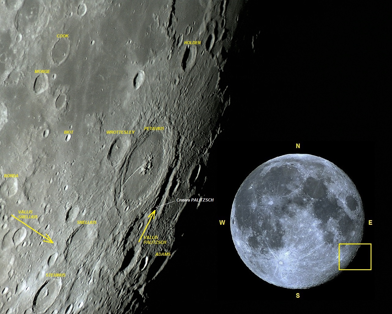 Foto: O Vallis PALITZSCH, a Cratera PALITZSCH (início sul do vale) a grande Cratera PETAVIUS, o Vallis SNELLIUS e demais formações próximas. A abrangência da foto na superfície lunar também é apresentada. Foto por VTOL em 08 de abril de 2012, 02:25:02 (05:25:02 UT).