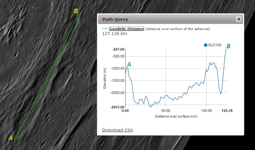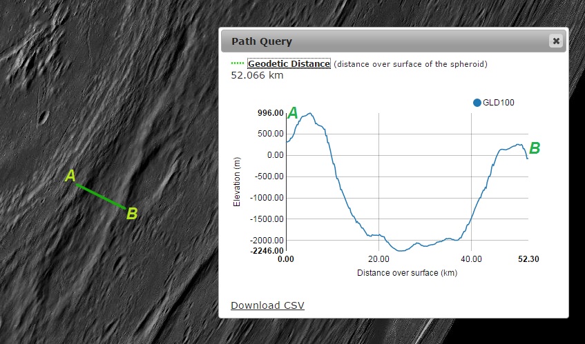 Imagem: O perfil altimétrico transversal do Vallis PALITZSCH - LRO QuickMap.