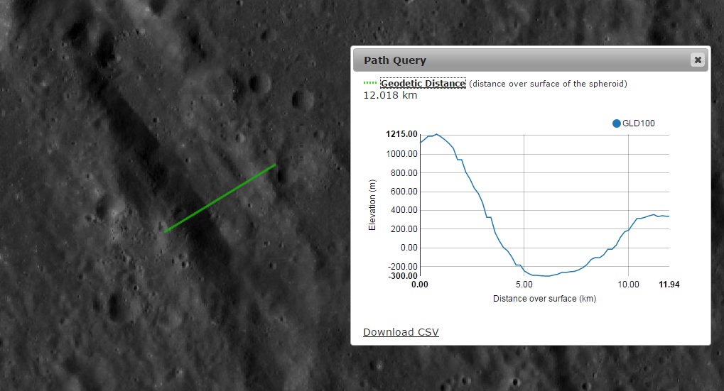 Imagem: O perfil transversal do Vallis Gyldén, apresentando largura em torno dos 10 Km - LRO QuickMap.