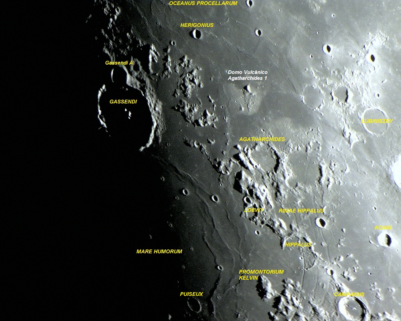 Foto: O diferenciado Megadomo "Agatharchides 1", com sua alta taxa de albedo, localizado a leste da bela e grande cratera de piso fraturado GASSENDI. Foto executada por VTOL em 04 de março de 2012, 21:04:48.